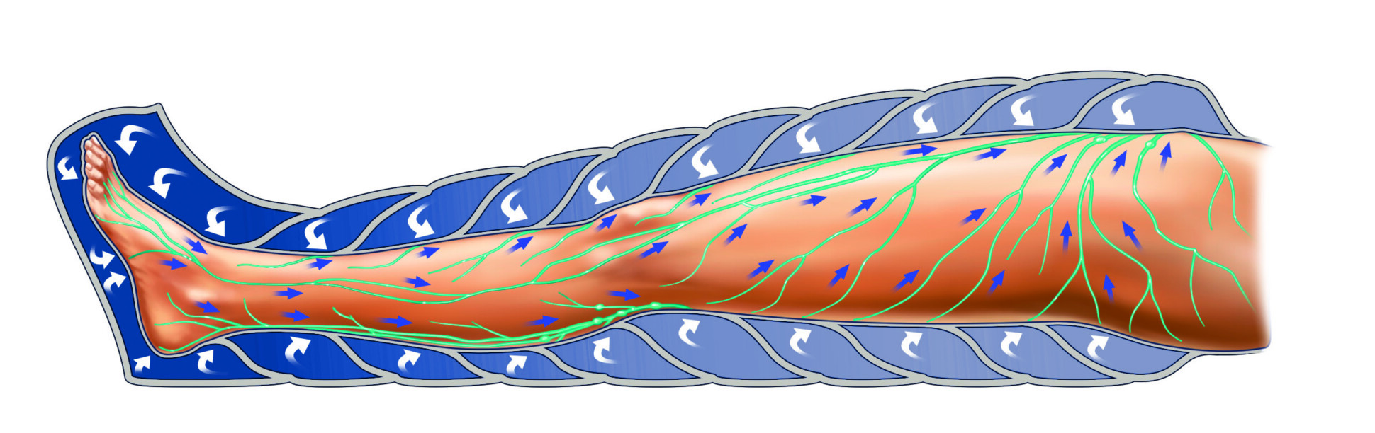 Aparat działa na zasadzie przerywanego pneumatycznego ucisku (pre-soterapia). Wykorzystuje przesuwającą się falę uciskową do wykonania kompresyjnego drenażu limfatycznego. Zabiegnie wymaga wsparcia farmakologicznego, przez co jest chętnie wybierane przez pacjentów ceniących sobie naturalne formy terapii. Pacjent zakłada na nogi kombinezon, aplikatory obejmują także część brzuszną i przypominają spodnie. Są one napełniane sprężonym strumieniem powietrza, doprowadzanym z jednostki podstawowej (kompresora) przez system giętkich przewodów. Każdy rękaw składa się z wielu niezależnych od siebie komór, które wypełniają się rytmicznie powietrzem we wcześniej zdefiniowanych cyklach w zależności od diagnozy pacjenta. Komory zachodzą na siebie, dzięki czemu masaż obejmuje równomiernie cały obszar. Delikatne, rytmiczne fale uciskowe tworzą wolno przesuwający się ucisk.